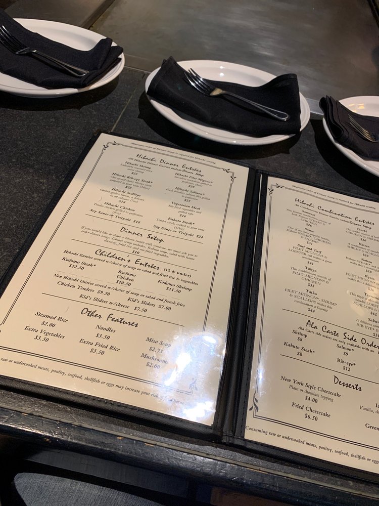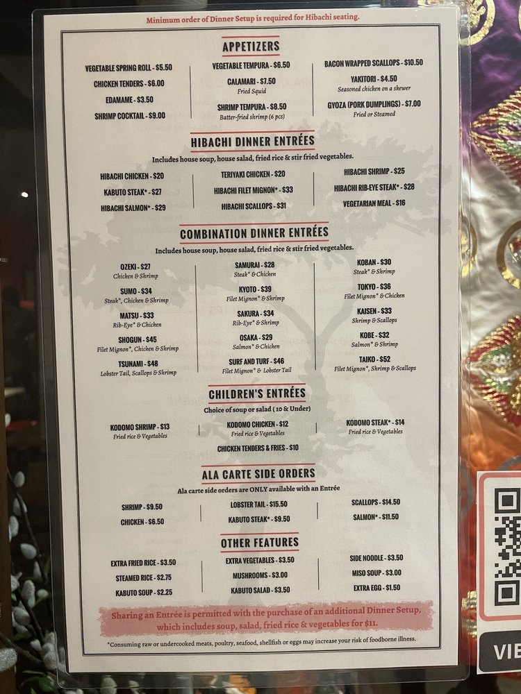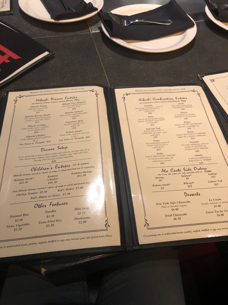 Introducing the menu at Kabuto Japanese House of Steaks and Sushi, located in Midlothian, VA, known for its hibachi lunch options including Kabuto Steak Lunch, Hibachi Chicken Lunch, and Vegetarian Lunch. The extensive appetizer menu offers delights like Gyoza, Shrimp Tempura, and Beef Tataki. For dinner, indulge in Hibachi Steak, Chicken, Shrimp, Rib-Eye Steak, and more. Customers praise the generous portions, flavorful dishes, and attentive service. The ambiance is family-friendly and inviting, offering a show with the skilled chefs. Whether dining in for a special occasion or ordering takeout, Kabuto Japanese House of Steaks and Sushi provides a satisfying culinary experience. Don't miss out on the tasty sushi rolls and hibachi options that have impressed customers and keep them coming back for more.
